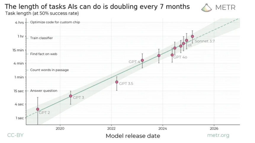 The reason we couldn’t do this until recently is because we hadn’t scaled compute up enough. However, as we build bigger models and spend more compute on inference (the part where it stops to think step-by-step), models are getting better at long term tasks. In fact, the length of time they can work productively is doubling every 7 months.